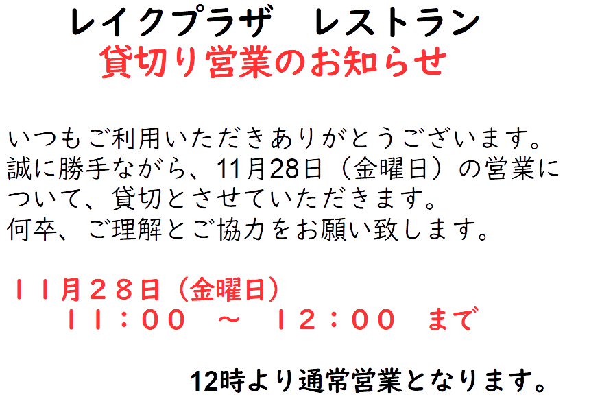 レイクプラザ レストラン 貸切り営業のお知らせ