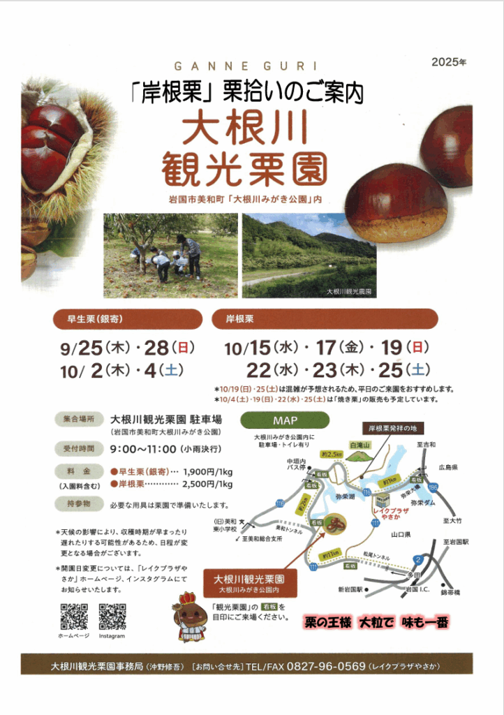 やさかでは、今年から地元の特産品「岸根ぐり」の栗拾いができる大根川観光栗園の管理運営を受託することになりました。